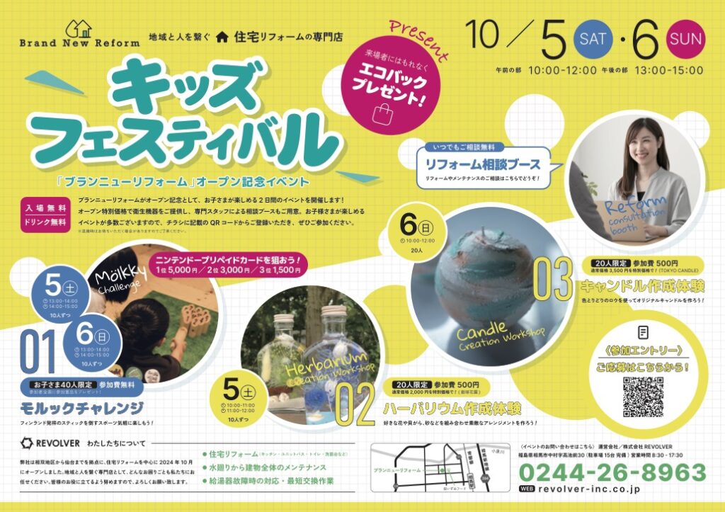 2024.09.28 10/5・10/6 キッズフェスティバル開催 地域と人を繋ぐ住宅リフォームの専門店ブランニューリフォーム「オープン記念イベント」を開催いたします。 イベント内容:01.モルックチャレンジ(上記特典獲得するとニンテンドープリペイドカードをプレゼント!)02. ハーバリウム作成体験03.キャンドル作成体験 当イベントに参加するにはご予約が必要になります。下記ご予約フォームよりお申し込みをお願いいたします。 ご予約はこちら